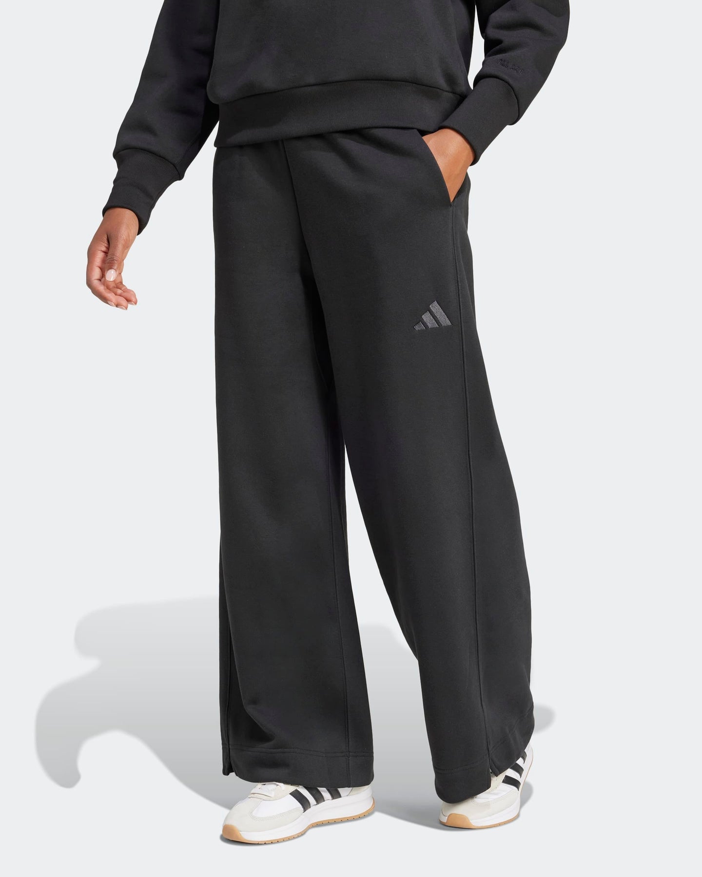 Wide legs give these adidas pants a modern silhouette that pairs well with fitted tops and baby tees. Cotton-blend fleece puts you at ease, while the loose cut gives you plenty of room to move and a laid-back vibe. An embroidered logo adds a subtle touch of sport-inspired style.
