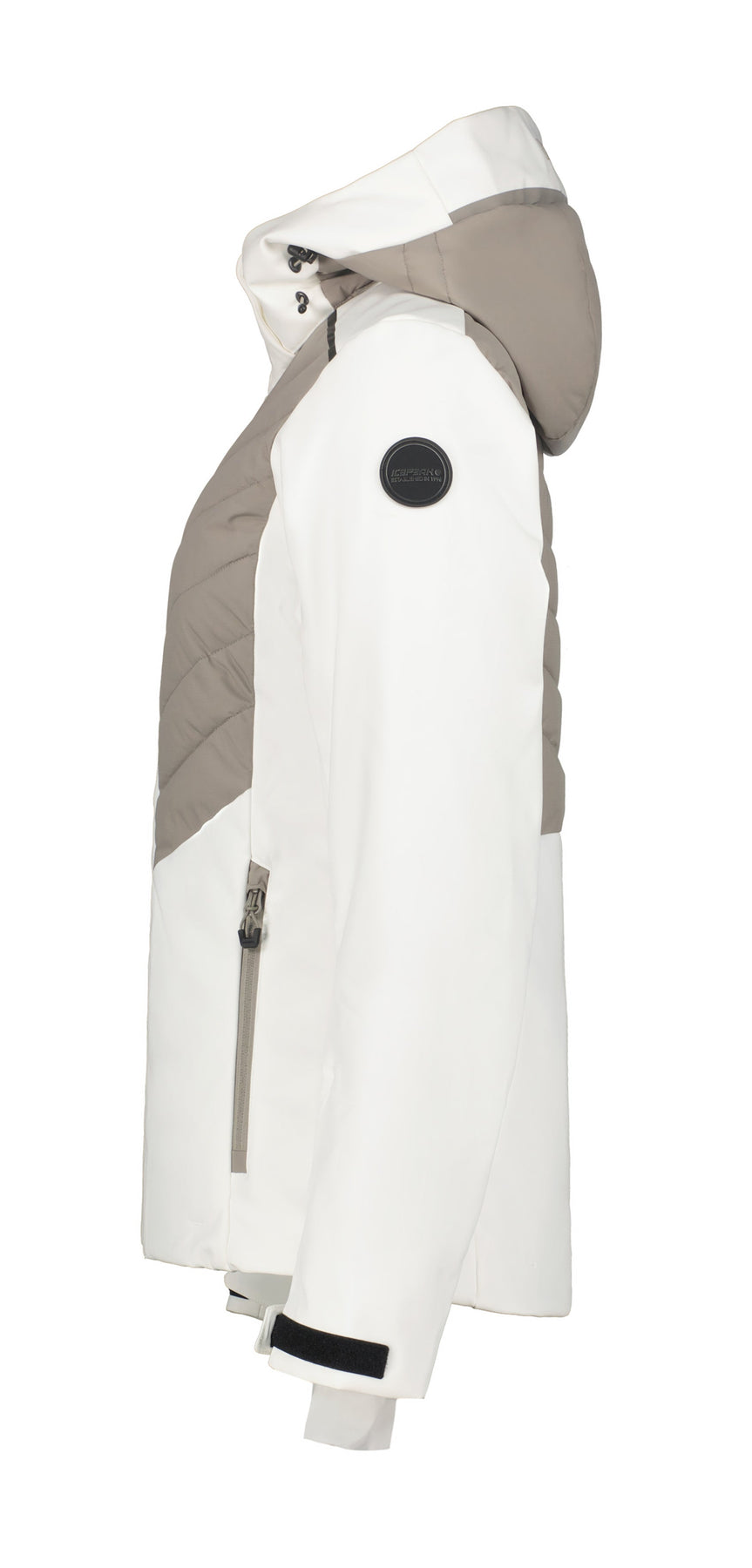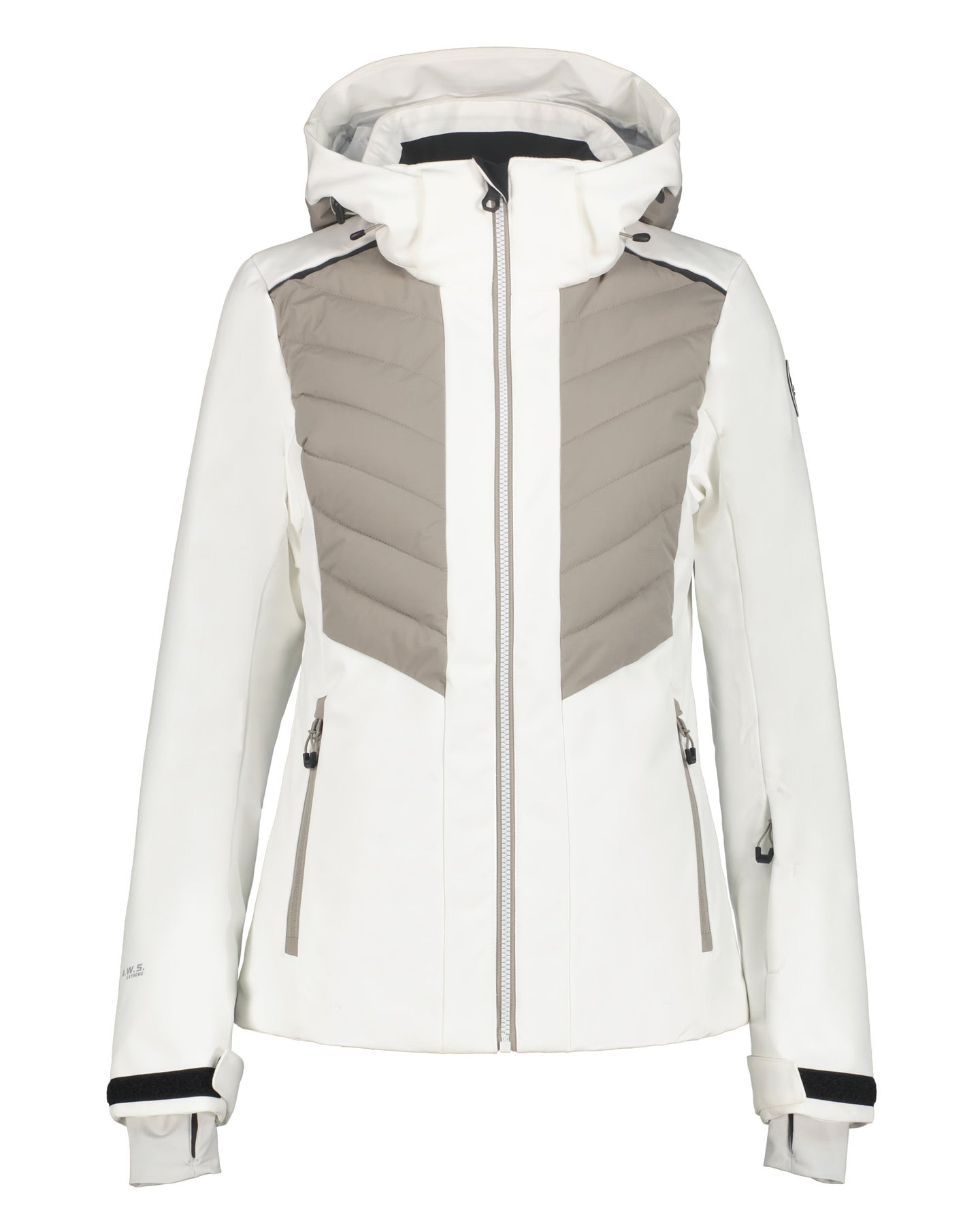Icepeak wadded jacket for women. Articulated elbows. Comfortable inner collar. Detachable and adjustable hood. Adjustable cuffs. Elastic inner cuffs with thumbholes. Snow gaiters with anti-slip silicone band. Large internal mesh pocket. Ski pass pocket on the sleeve. Wind placket. Chin guard on the front zip. Adjustable hem. Fixed snow gaiter. Water column 10 000 mm. Breathability 8 000 g\m2\24h. This A.W.S. EXTREME product meets the needs of active outdoor people even in extreme conditions. Structural details and protective materials make the product functional in every weather. Contains recycled material. Softshell is a functional material for a wide range of outdoor activities. The product provides weather protection while being comfortably flexible at the same time. The 2-way stretch material increases the freedom of movement. The fabric surface has been treated with a water-repellent finish. Light insulation.